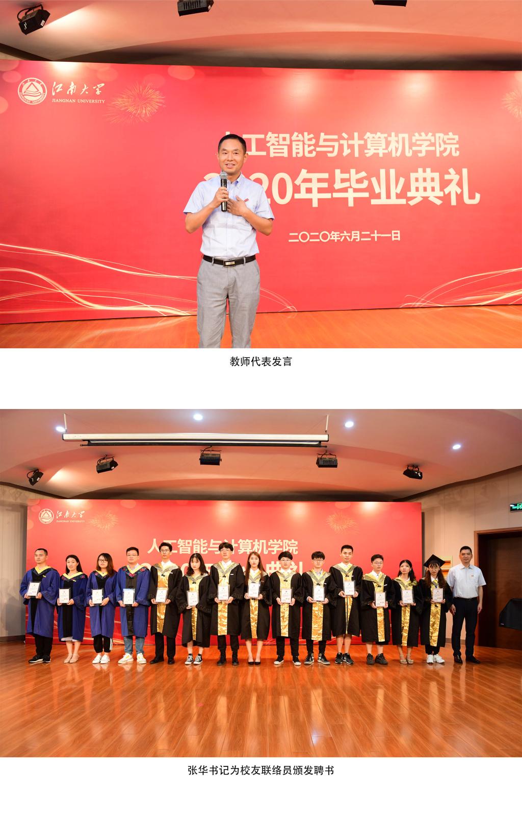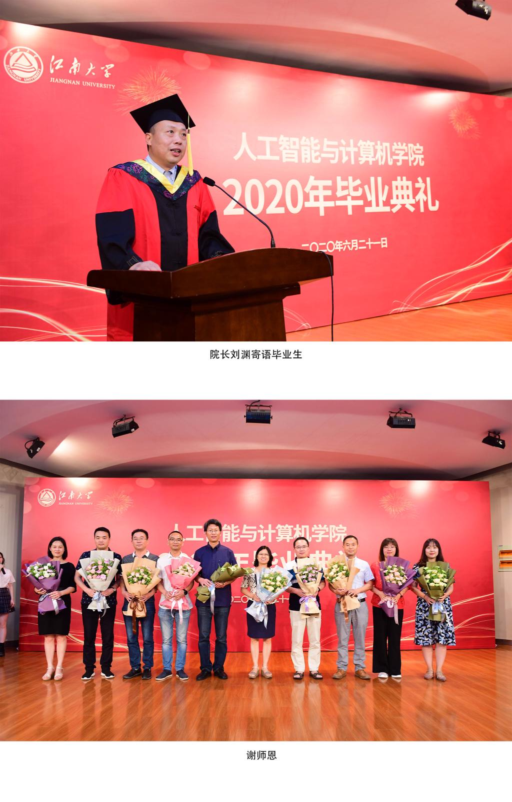 在北活音乐厅隆重举行2020届毕业典礼,欢送名本科毕业生和名毕业研究生。学院党委书记张华,院长刘渊,副院长柴志雷、夏鸿斌,副院长谢振平、院长助理钱鹏江出席典礼,全体班主任老师及毕业生代表到场参加,其他毕业生、学生家长千里共聚“云端”,参加属于自己的青春盛典。典礼仪式由学院党委副书记兼副院长陈祎主持。暖场环节,学院精心准备了15道有关江南印记的抢答题,题目带领全体毕业生共同回忆了四年在江南熟悉的场景和温暖的画面。“笃学尚行的信仰永远铭记于心,止于至善的精神永远落入实践”毕业生代表深情款款的诗朗诵诉说了离别之际的依依不舍。