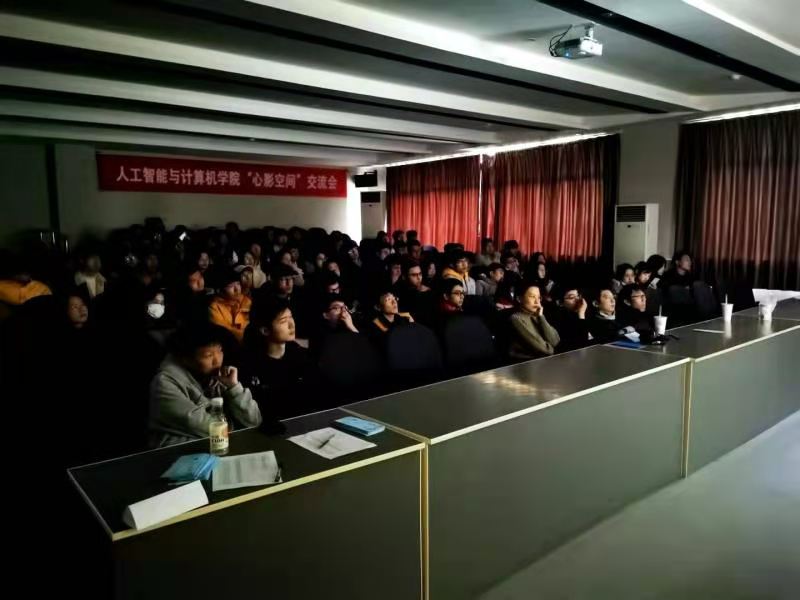 116报告厅内座无虚席,“心影空间”主题电影展播活动即将开始,本次展播的电影是《心灵捕手》,影片吸引了100余名同学前来观看。