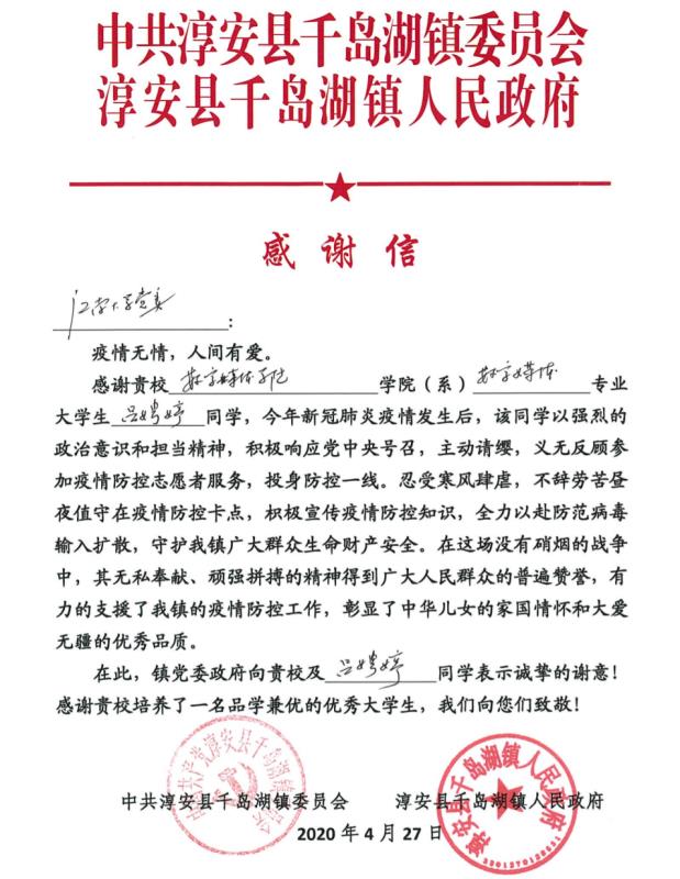 数媒1802班的吕娉婷平时就热心公益,在2月15日到2月17日期间,她参与了浙江杭州千岛湖南苑社区的疫情防控志愿服务。“当时看到社区招募志愿者,我就立马报名参加了,社区给我分配了两个工作日。早上六点,我戴好口罩,站在小区的专门服务点,配合社区的工作人员,对进出小区的人进行登记,查看、核实他们手机上的健康绿码。二月份我们小区进进出出的人并不多,在服务点连续站岗几个小时有点冷也有点累,但是为社区服务真的很开心。”当被问到志愿服务经历时,吕娉婷同学这样说到。当地政府——淳安县千岛湖镇人民政府也向学院发来感谢信,对98堂