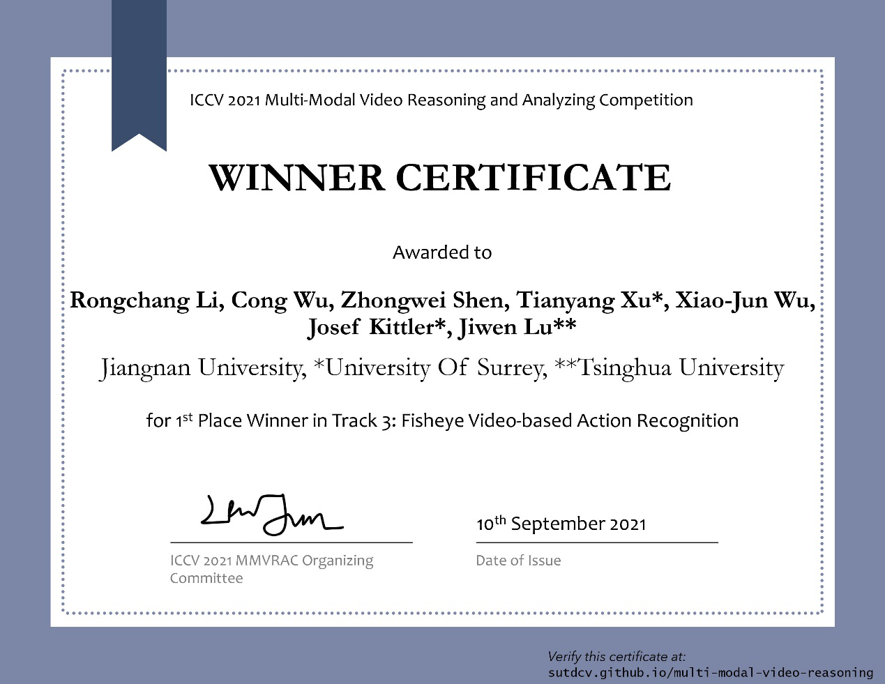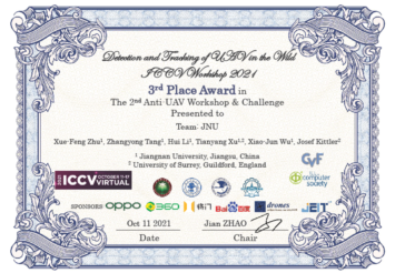 此前,在2021下半年人工智能领域顶级会议国际计算机视觉大会(IEEE International Conference on Computer Vision, ICCV2021)上,我校团队与英国Surrey大学和清华大学合作荣获了多模态视频推理分析比赛MMVRAC中2项冠军(吴聪,李荣昌,沈忠伟,徐天阳,吴小俊,JosefKittler,鲁继文)和第二届CVPR反无人机Anti-UAV跟踪竞赛季军(朱学峰、汤张泳,李辉,徐天阳,吴小俊,JosefKittler)。近年来我校大力推进市校合作和国际合作,大力支持人工智能快速发展,我校在人工智能领域获得的这些重要荣誉和奖项,将进一步提高98堂