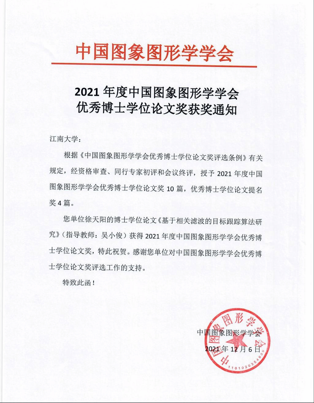 人工智能,作为社会发展的驱动力,已经进入到我们生活以及军事领域的各个方面。在近期,我校在人工智能领域中获得了多项奖励。近日,我校人工智能科研团队又获重要科研成果奖励。吴小俊教授指导的博士学位论文《基于相关滤波的目标跟踪算法研究》荣获了2021年度中国图象图形学学会(CSIG)优秀博士学位论文奖(徐天阳,吴小俊)。该奖项在全国范围内仅有十篇论文入选,参加竞选的学位论文大多来自国内的知名高校,这也是98堂