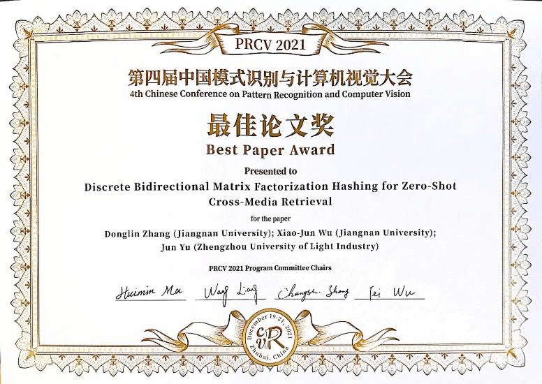 随着多媒体和互联网技术的发展,生活中出现了大量的多媒体数据,这些数据呈现着多模态及复杂关联的特性,检索需求已经从单模态检索转化为了不同模态之间的交叉检索。为此,博士生张东霖提出了“离散双向矩阵分解的零样本跨媒体检索”方法,该方法可以通过双向矩阵分解方案离散地学习到不同数据的共同表示,从而完成检索任务。在该方向上取得的突破,荣获了PRCV2021最佳论文奖(张东霖,吴小俊,庾骏)。