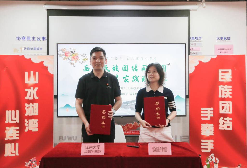 学院党委书记张华和石塘社区党委书记蔡洁心共同签署铸牢中华民族共同体意识社会实践基地建设项目协议。