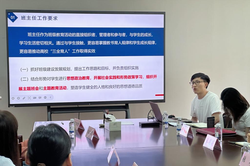 会上,新生辅导员李猛基于“三全育人”理念,从学生思想政治教育、班级建设和日常管理、学风建设等方面介绍班主任工作的具体职责和要求,详细解读98堂