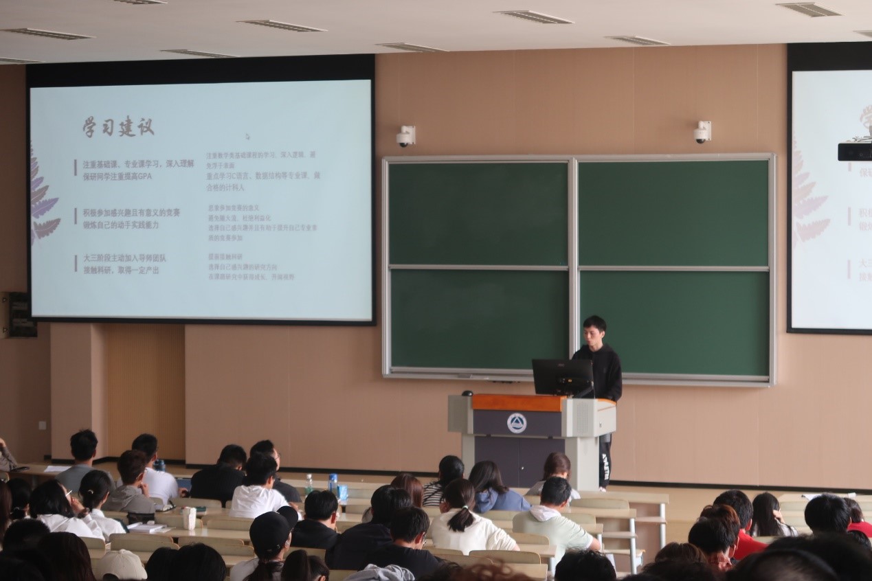 马力从班级建设、学习建议、个人总结三方面进行了经验分享。阐明了班委的职责,并不断通过团建、主题班会来增强班级凝聚力,鼓励同学们积极参加集体活动,增强集体荣誉感。建议同学们在学期间明确自己的兴趣点,有针对性地学习。