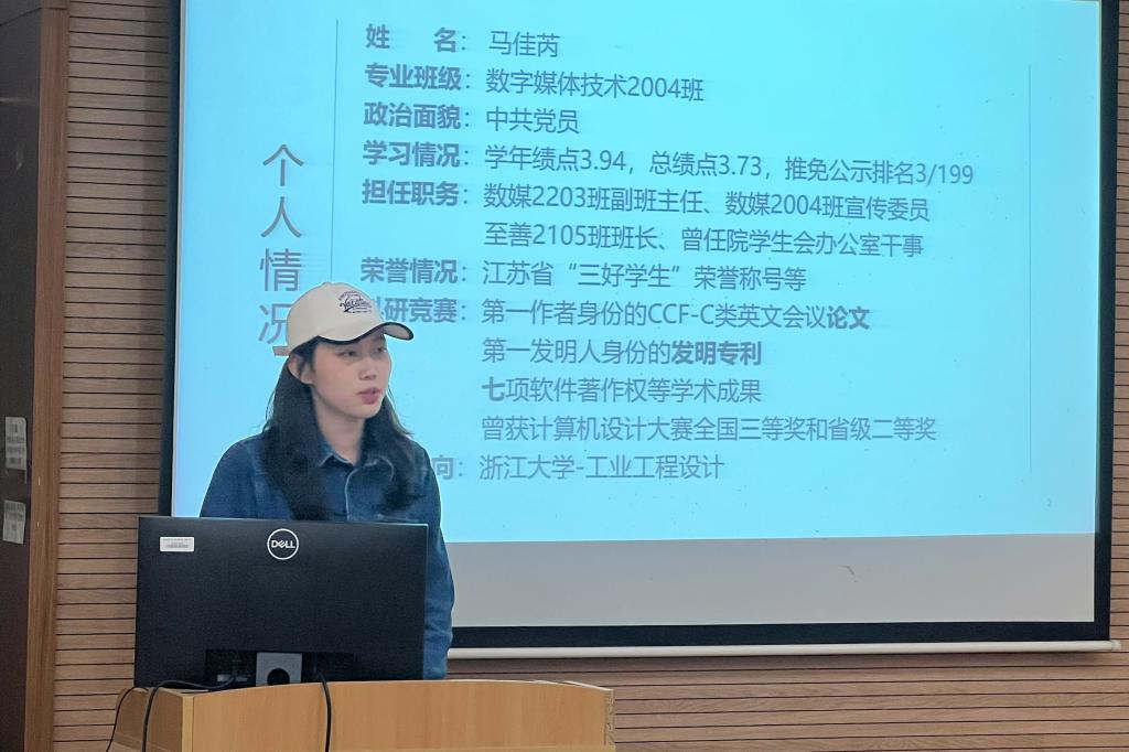 随后,保研至浙江大学工业工程设计专业的马佳芮同学作分享。她以个人经历为切入点,建议同学们在大学学习中要树立理想和现实两个目标,在追求进步的过程中要保持乐观的心态,并且要在能力所及的范围之内尽可能去争取发展机会。她为同学们梳理了数字媒体技术专业本科期间可以参加的主要科创竞赛项目并给出了明晰的努力方向。