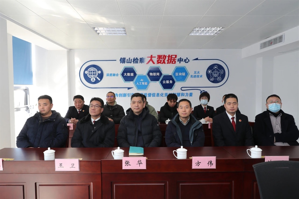 在锡山区检察院与会人员的陪同下,我院领导教师先后参观了检查服务中心、检查办案区、有声党建区、检查监督大数据中心等锡山检察院的办公区域。双方共同观看了公益诉讼智能研判平台的现场演示,了解人工智能与信息化技术应用于司法数字化建设的具体情况。
