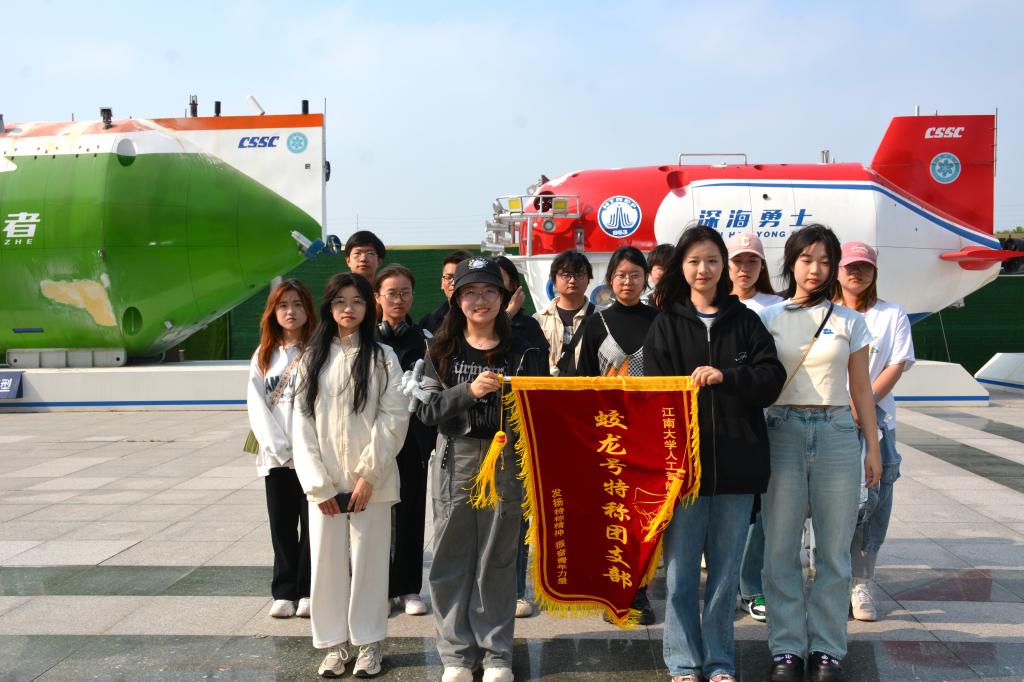 在讲解员的带领下,全体成员依次参观了太湖楼外“蛟龙”号、“深海勇士”“奋斗者”等深潜模型。讲解员指出,“蛟龙”号载人深潜器创造了世界同类潜水器最大下潜深度纪录。如今“蛟龙”号已经是第二代载人深潜器,拥有世界上最大的作业深度——7000多米,且拥有水声通信、海底探测等方面的能力,达到了世界先进水平。“蛟龙”号的成功,在于科研团队每个人的心中都怀抱着同样坚定的梦想——向海洋强国迈进。
