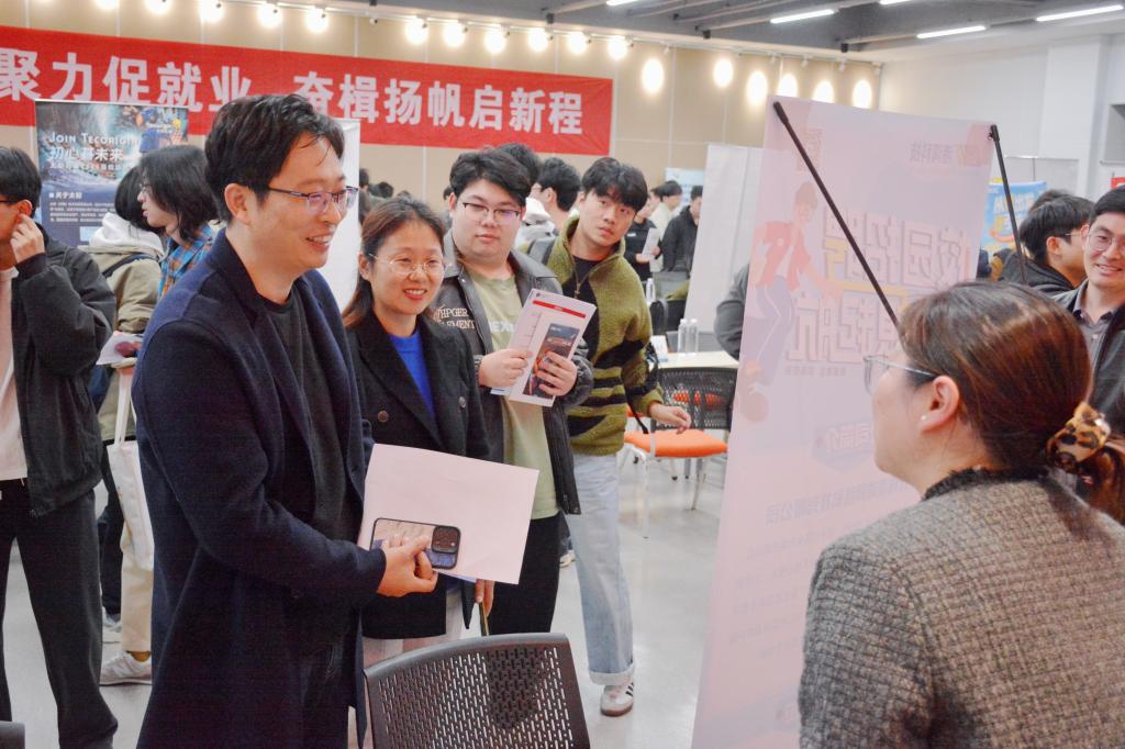 各企业单位充分利用易拉宝展示、分发宣传资料及现场宣讲等多种形式,向求职学生热情介绍自身98堂、招聘需求、福利待遇、产业结构等,并对同学们关心的问题进行了详尽解答,帮助同学们高效选择合适岗位。求职学生认真聆听企业代表们的介绍,积极与企业进行互动交流,向心仪企业投递简历。他们纷纷表示,此次招聘会到场企业专业匹配度高,为他们提供了直观了解企业需求、明确求职方向的宝贵机会。各承办学院党委副书记、毕业班辅导员、班主任和部分专业教师也在现场与用人单位进行主动对接,多渠道、全方位向用人单位积极推介优秀毕业生。