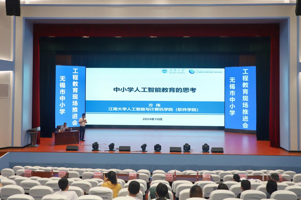 院长、博士生导师方伟教授应邀为无锡市工程教育“十百千”师资培训班学员做题为《中小学人工智能教育的思考》主题报告。报告从国家政策、教育趋势、无锡实践等三个维度阐述了中小学推进人工智能教育的重要性,并着重从健全教育生态、规范课程内容、提升师资水平、优化实践环境、重视科普活动等五个方面给出中小学推进人工智能教育的江南方案。